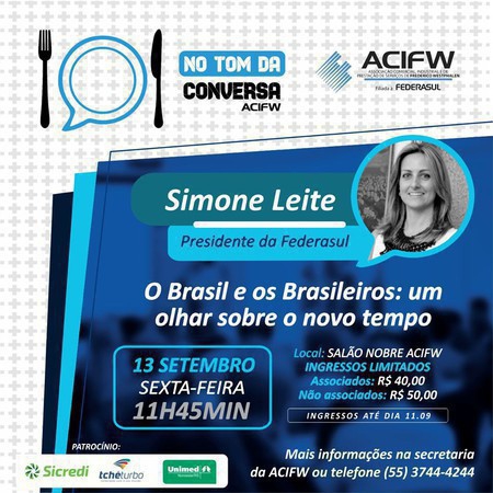 Simone Leite, presidente da Federasul estará na ACI de Frederico Westphalen nesta sexta-feira 13 de setembro, às 11h45, com a palestra “O Brasil e os brasileiros: um olhar sobre o novo tempo", no projeto “No tom da conversa”, desenvolvido pela atual gestão da Associação.