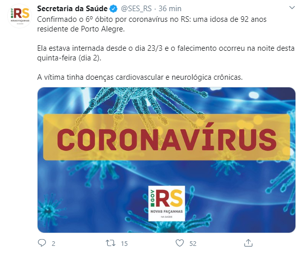 O Rio Grande do Sul registrou a sexta morte por coronavírus, a morte foi e uma idosa de 92 anos em Porto Alegre, ela já havia falecido na última quinta-feira, 26 de março, mas só foi notificada hoje, 3 de abril, pela Secretaria Municipal de Saúde.