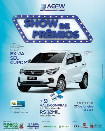 Realizada pela Associação Empresarial ACI/CDL de Frederico Westphalen e Prefeitura de Frederico Westphalen, a tradicional Campanha Show de Prêmios irá sortear um carro 0km e mais 12 mil reais em vale-compras na próxima sexta-feira, dia 07 de janeiro, às 9h30, no salão nobre da Associação.