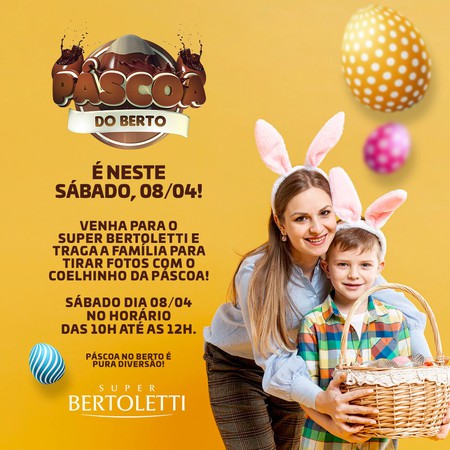 Em clima de Páscoa, o Supermercado Bertoletti preparou uma programação especial para este sábado, 8 de abril. A ação será das 10 horas ao meio-dia com a presença do “Coelhinho da Páscoa”.