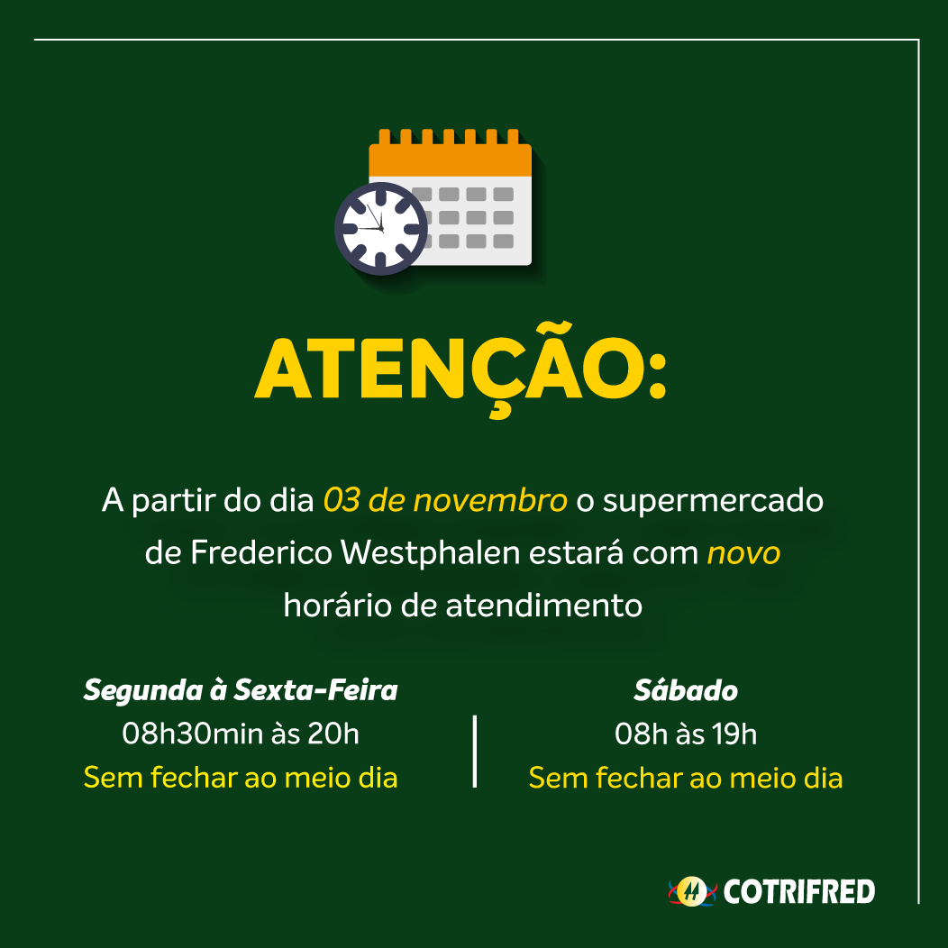 Supermercado da Cotrifred de Frederico Westphalen, terá alterações de horário de atendimento a partir dia 3 de novembro. De segunda a sexta, o horário de funcionamento será das 8h30min às 20h. Já aos sábados, o Mercado Público irá atender das 8h às 19h. Todos os dias sem fechar ao meio dia.