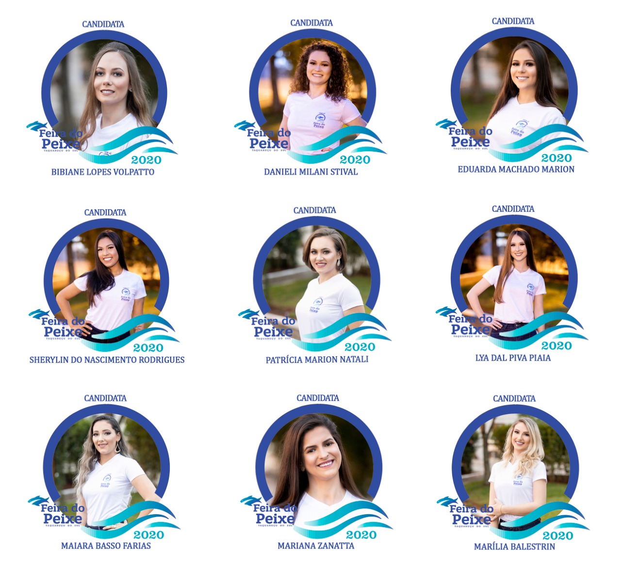 Concorrem aos títulos de rainha, primeira-princesa e segunda-princesa da Feira do Peixe 2020/2021 Bibiane Lopes Volpatto; Danieli Milani Stival; Eduarda Machado Marion; Lya Dal Piva Piaia; Maiara Basso Farias; Mariana Zanatta; Marília Balestrin; Patrícia Marion Natali e Sherylin do Nascimento Rodrigues.