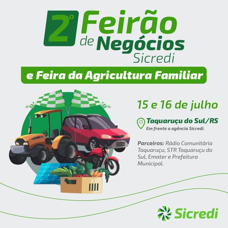 O 2º Feirão de Negócios Sicredie acontecerá em Taquaruçu do Sul/RS, nos dias 15 e 16, no Centro de Eventos Sadi Zanatta, em frente à agência. A programação será desenvolvida pela Sicredi Alto Uruguai RS/SC/MG, prefeitura, Emater-RS-Ascar, Sindicato dos Trabalhadores Rurais, Rádio Comunitária e produtores locais.