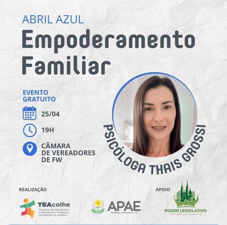 Em alusão ao Abril Azul, mês de conscientização sobre o Autismo, o Programa TEAcolhe e a Associação dos Pais e Amigos dos Excepcionais (Apae), com apoio do Poder Legislativo de Frederico Westphalen, realizarão um evento gratuito, no dia 25 de abril, às 19 horas, na Câmara de Vereadores. Na oportunidade, será ministrada uma palestra com a psicóloga, Thais Grossi, com o tema “Empoderamento familiar”.