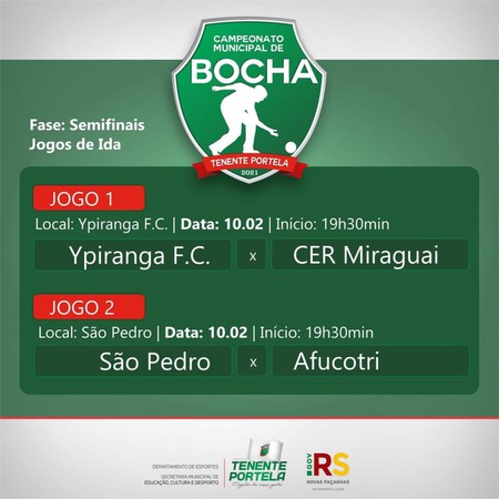 O Campeonato Municipal de Bocha de Tenente Portela terá na noite desta sexta-feira, 10, os confrontos de ida da fase semifinal. Em São Pedro acontece o clássico “Miranga” (Miraguai e Ypiranga) e em Alto Alegre o duelo Afucotri x São Pedro.