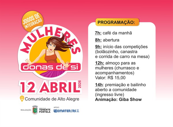A Comunidade de Alto Alegre, no interior de Tenente Portela, recebe no dia 12 de abril a programação especial “Mulheres Donas de Si”, iniciativa voltada à integração, valorização e convivência entre mulheres da comunidade e da região.