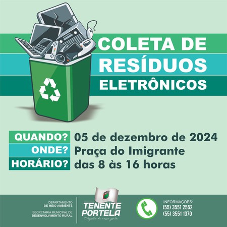 A Prefeitura de Tenente Portela marcou para 5 de dezembro a data para a coleta seletiva de resíduos eletrônicos no município. A ação acontecerá na Praça do Imigrante, das 8 às 16 horas, e é promovida pela Secretaria Municipal de Desenvolvimento Rural, por meio do Departamento de Meio Ambiente.
