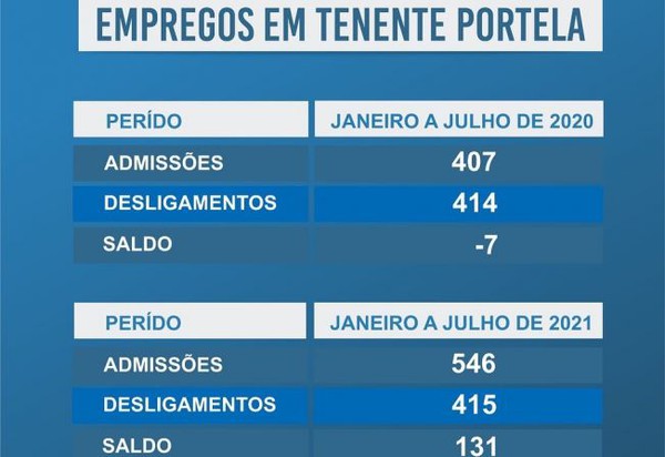 Os sete primeiros meses deste ano apresentaram números positivos na geração de empregos formais, em Tenente Portela. Conforme dados divulgados pela Secretaria Municipal de Desenvolvimento Econômico e Turismo, as contratações foram de 546 e as demissões de 415, o que resulta em um saldo de 131. As informações têm como base o Cadastro Geral de Empregados e Desempregados (CAGED). Este registro, vinculado ao Ministério do Trabalho e Emprego, reúne as informações sobre admissões e dispensa de empregados, sob o regime da Consolidação das Leis do Trabalho (CLT).