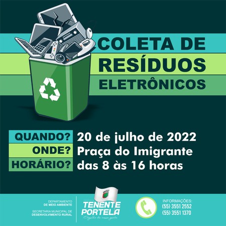A Secretaria de Desenvolvimento Rural, através do Departamento de Meio Ambiente, programou para 20 de julho a próxima coleta seletiva de resíduos eletrônicos em Tenente Portela. O local de recolhimento será a Praça do Imigrante, das 8 horas às 16 horas.