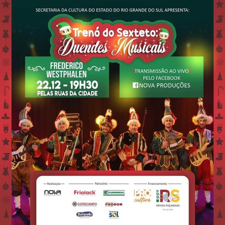 Na noite desta terça-feira, 22 de dezembro, o Trenó do Sexteto: Duendes Musicais, irá percorrer as ruas de Frederico Westphalen, a partir das 19h30 nos bairros Itapagé, Centro e Aparecida.
