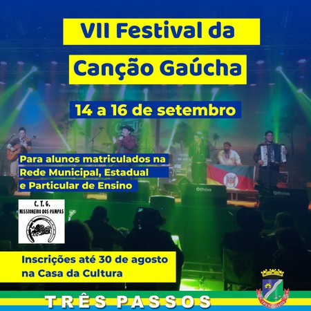 A Administração Municipal de Três Passos, através da Casa da Cultura Professor Orestes Luiz Colombo, em parceria com o CTG Missioneiro dos Pampas, realizam o VII Festival da Canção Gaúcha.