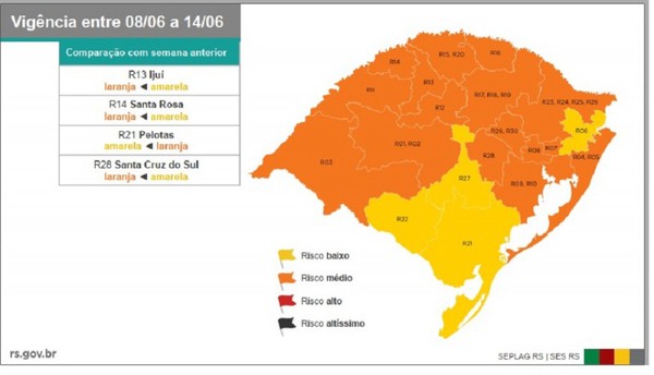 Das 20 regiões em que foi dividido o território gaúcho, três que estavam com bandeira amarela (risco baixo) passaram para laranja (risco médio): Ijuí, Santa Rosa e Santa Cruz do Sul. Na atualização divulgada neste sábado (6/6), apenas a região de Pelotas apresentou melhora, reduzindo de laranja para amarela.