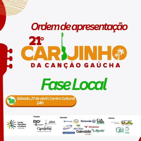 A triagem da fase local do 21º Carijinho da Canção Gaúcha que recebeu 36 inscrições acontece nesta sexta-feira, no palco do Anfiteatro Pedro Barreiro, do Centro Cultural Mozart Pereira Soares, a partir das 14h do dia 27 de abril, com entrada gratuita.