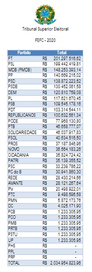 O Tribunal Superior Eleitoral (TSE) divulgou, na noite desta quarta-feira, 17, a tabela atualizada com a divisão dos recursos do Fundo Especial de Financiamento de Campanha (FEFC) destinado aos partidos políticos para as Eleições Municipais de 2020. O recálculo da distribuição foi feito com base na decisão unânime da Corte ocorrida no julgamento de um processo administrativo na sessão plenária de terça-feira, 16.