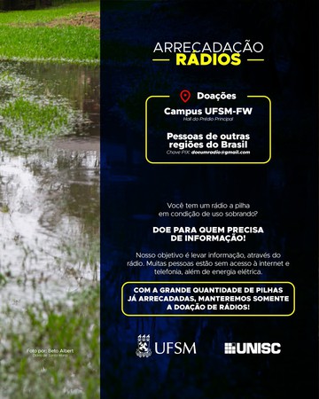 A Universidade Federal de Santa Maria (UFSM), em parceria com a Universidade de Santa Cruz do Sul (UNISC), lançou uma campanha para arrecadar rádios de pilha com o objetivo de levar informação às comunidades afetadas pelas chuvas no Rio Grande do Sul.