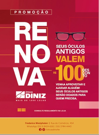 Ano novo, hora de renovar seus óculos de grau, na Ótica Diniz, além de sair com um óculos novo você ainda pode ajudar quem precisa. A promoção Renova Diniz está na última semana mas, com ela, seu óculos antigo vale R$ 100 e as armações em boas condições de uso, são repassadas a instituições de caridade e pessoas que precisam.