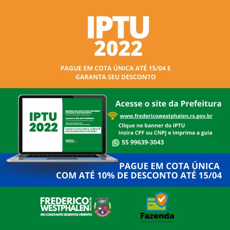 Imprima a guia do IPTU 2022 em www.fredericowestphalen.rs.gov.br.