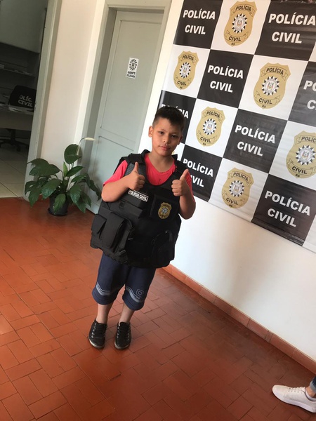 Na delegacia o menino conheceu mais sobre o trabalho da polícia e até vestiu um colete a prova de balas.