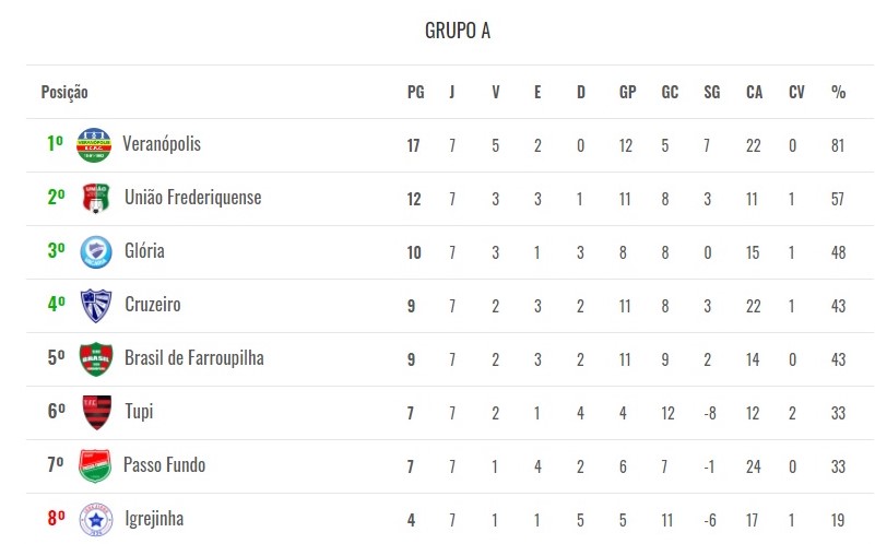 Quem lidera a chave é o Veranópolis (17 pontos), seguido pelo União (12 pontos), Glória de Vacaria (10 pontos), Cruzeiro de Cachoeirinha (9 pontos), Brasil de Farroupilha (9 pontos), Tupi de Crissiumal (7 pontos), Passo Fundo (7 pontos) e o Igrejinha (4 pontos), que é o lanterna.