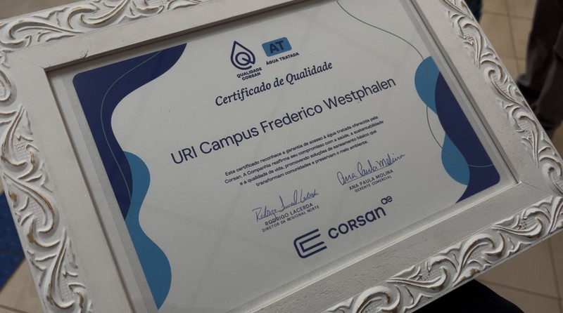 A URI campus Frederico Westphalen é a primeira instituição da região do Alto Uruguai e a primeira universidade do Norte do Estado a receber o selo de certificação da qualidade da água tratada pela Corsan. A entrega do certificado ocorreu na manhã desta quinta-feira, 14 de agosto, em cerimônia que contou com a presença de autoridades e convidados.