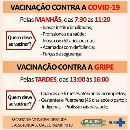 Doses da Covid-19 estão sendo aplicadas pela manhã e da influenza pela parte da tarde