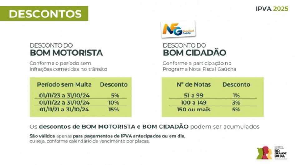 O Bom Motorista, por exemplo, reduz até 15% do imposto para aqueles que estiverem há três anos sem cometer infração de trânsito. Já o programa Bom Cidadão oferece desconto de 5% para quem possuir, no mínimo, 150 notas fiscais com CPF emitidas entre 1º de novembro de 2023 e 30 de outubro de 2024.