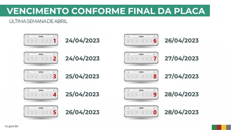 Começa, na segunda-feira, 24 de abril, o calendário de vencimentos do IPVA seguindo cronograma por numeração final da placa do automóvel. Na segunda-feira, 24 de abril, termina o prazo para quitação de veículos com final “1” e “2”. O vencimento dos números seguintes ocorre ao longo da semana.