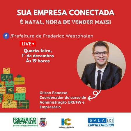 Nessa quarta-feira, 1º de dezembro, será transmitida mais uma live do projeto Sua empresa conectada. A iniciativa da Administração Municipal de Frederico Westphalen é realizada pela Secretaria de Indústria, Comércio e Turismo e Sala do Empreendedor.