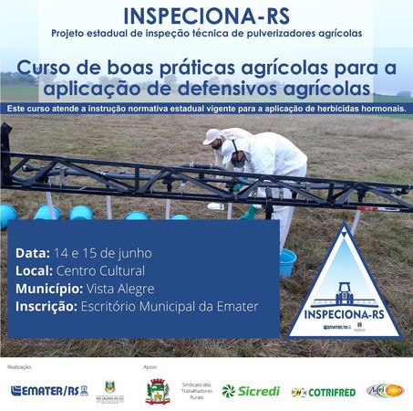 Este curso atende a instrução normativa estadual vigente para a aplicação de herbicidas hormonais e faz parte do projeto Estadual de inspeção técnica de pulverizadores agrícola: inspecionar-RS. As vagas são limitadas e inscrições estão sendo realizadas na EMATER e/ou na Secretaria de Agricultura do Município.