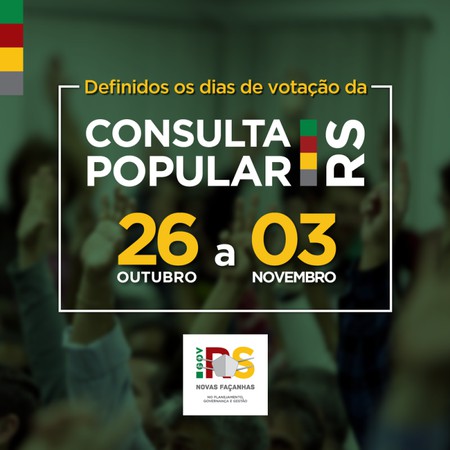 O governo do Estado, por meio da Secretaria de Planejamento, Governança e Gestão (SPGG), confirmou as datas de votação da Consulta Popular 2020. Realizado totalmente de forma virtual no site www.consultapopular.rs.gov.br ou por SMS entre 26 de outubro e 3 de novembro de 2020, o processo vai encaminhar a aplicação de R$ 20 milhões em projetos para municípios das 28 regiões dos Conselhos Regionais de Desenvolvimento (Coredes).